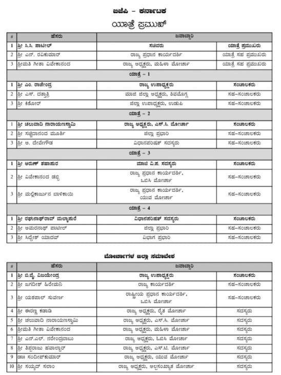ಯಾತ್ರಾ ಪ್ರಮುಖ್ಗೆ ಸಚಿವ ಸಿ.ಸಿ.ಪಾಟೀಲ್, ವಿಧಾನಪರಿಷತ್ ಸದಸ್ಯ ರವಿಕುಮಾರ್ ಹಾಗು ಮಹಿಳಾ ಮೋರ್ಚಾ ರಾಜ್ಯಾಧ್ಯಕ್ಷೆ ಗೀತಾ ವಿವೇಕಾನಂದ ಅವರನ್ನು ನೇಮಿಸಿದೆ.