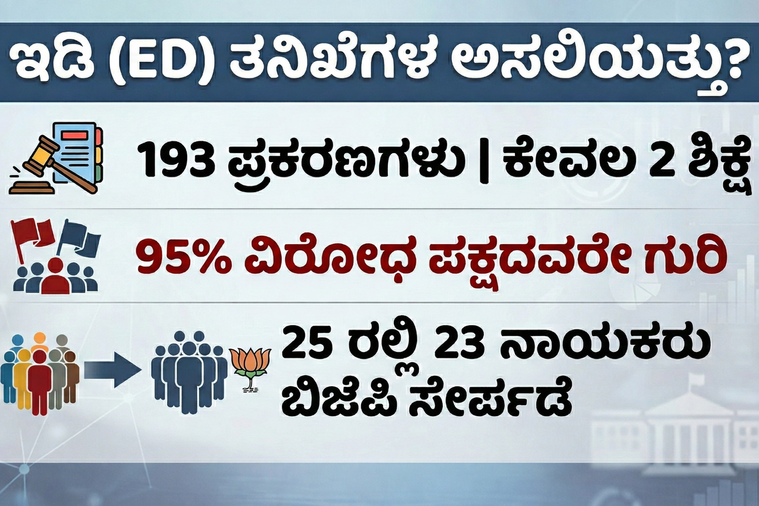 ಅಚ್ಚರಿಯೆಂದರೆ, ಇಡಿ ದಾಳಿಗೆ ಒಳಗಾದ 25 ಪ್ರಮುಖ ನಾಯಕರಲ್ಲಿ 23 ಮಂದಿ ನಂತರ ಬಿಜೆಪಿ ಸೇರ್ಪಡೆಯಾಗಿದ್ದಾರೆ. ಇದು ಬಿಜೆಪಿ ಸೇರ್ಪಡೆಯಾದವರಿಗೆ ಇಡಿ ತನಿಖೆಯಿಂದ ‘ರಕ್ಷಾ ಕವಚ’ ಸಿಗುತ್ತದೆಯೇ ಎಂಬ ಪ್ರಶ್ನೆಯನ್ನು ಹುಟ್ಟುಹಾಕಿದೆ. ಇಡಿ ಸಂಸ್ಥೆಯು ಭ್ರಷ್ಟಾಚಾರದ ವಿರುದ್ಧ ಹೋರಾಡುವ ಬದಲು, ಚುನಾವಣೆಗಳ ಸಮಯದಲ್ಲಿ ವಿರೋಧ ಪಕ್ಷದ ನಾಯಕರ ಪ್ರತಿಷ್ಠೆಗೆ ಧಕ್ಕೆ ತರಲು ಮತ್ತು ಅವರನ್ನು ಮಾನಸಿಕವಾಗಿ ಕುಗ್ಗಿಸಲು ಬಳಕೆಯಾಗುತ್ತಿದೆ ಎಂಬ ಆರೋಪಕ್ಕೆ ಈ ಅಂಕಿಅಂಶಗಳು ಪುಷ್ಟಿ ನೀಡುತ್ತಿವೆ. 193 ಪ್ರಕರಣಗಳಲ್ಲಿ ಕೇವಲ 2 ಶಿಕ್ಷೆ ಎನ್ನುವುದು ಇಡೀ ತನಿಖಾ ಸಂಸ್ಥೆಯ ವಿಶ್ವಾಸಾರ್ಹತೆಯನ್ನೇ ಪ್ರಶ್ನಿಸುವಂತಿದೆ.