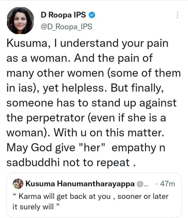 ಹಿರಿಯ IAS ಅಧಿಕಾರಿ ವಿರುದ್ಧ ಸಾಮಾಜಿಕ ಜಾಲತಾಣಗಳಲ್ಲಿ ಸಮರ ಸಾರಿರುವ ಹಿರಿಯ IPS ಅಧಿಕಾರಿ ಡಿ.ರೂಪಾ (D. Roopa) ಇದೀಗ ಆತ್ಮಹತ್ಯೆ ಮಾಡಿಕೊಂಡ IAS ಅಧಿಕಾರಿ ಡಿ.ಕೆ.ರವಿ (DK Ravi) ಅವರ ಪತ್ನಿ ಕುಸುಮಾ (Kusuma) ಅವರನ್ನು ಉಲ್ಲೇಖಿಸಿ ಟ್ವೀಟ್ ಮಾಡುವ ಮೂಲಕ ಗಮನ ಸೆಳೆದಿದ್ದಾರೆ.