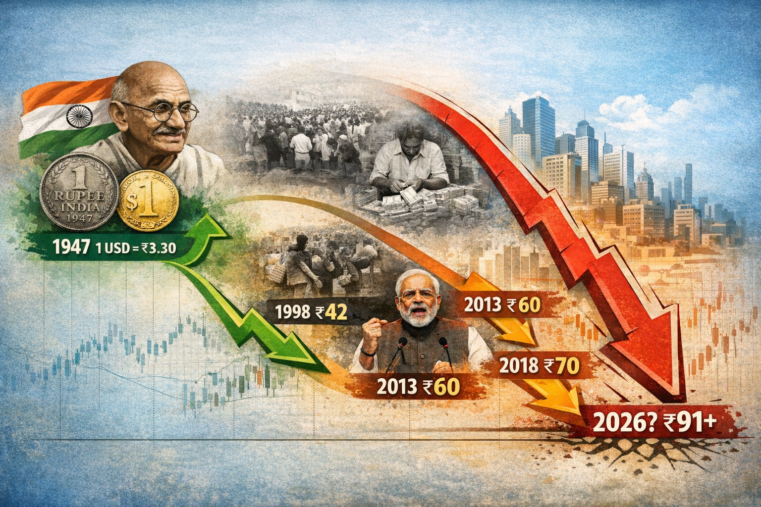 ಬೆಂಗಳೂರು: ಭಾರತಕ್ಕೆ ಸ್ವಾತಂತ್ರ್ಯ ದೊರಕಿದಾಗ ಒಂದು ಅಮೆರಿಕನ್ ಡಾಲರ್‌ನ ಬೆಲೆ ಕೇವಲ 3.30 ರೂಪಾಯಿ ಇತ್ತು ಎಂದರೆ ಇಂದಿನ ಪೀಳಿಗೆಗೆ ನಂಬಲು ಕಷ್ಟವಾಗಬಹುದು. ಆದರೆ, 2026ರ ಜನವರಿ ಹೊತ್ತಿಗೆ ಅದೇ ಡಾಲರ್ ಎದುರು ರೂಪಾಯಿ ಬರೋಬ್ಬರಿ 91ರ ಗಡಿ ಮುಟ್ಟಿದೆ. ಕಳೆದ 78 ವರ್ಷಗಳಲ್ಲಿ ಭಾರತೀಯ ರೂಪಾಯಿ ಸಾಗಿ ಬಂದ ಹಾದಿ, ಅದು ಎದುರಿಸಿದ ಆರ್ಥಿಕ ಏರಿಳಿತಗಳು ಮತ್ತು ಅದಕ್ಕೆ ತಳುಕು ಹಾಕಿಕೊಂಡಿರುವ ರಾಜಕೀಯದ ದ್ವಂದ್ವ ನೀತಿಗಳು ಅತ್ಯಂತ ಕುತೂಹಲಕಾರಿಯಾಗಿವೆ.