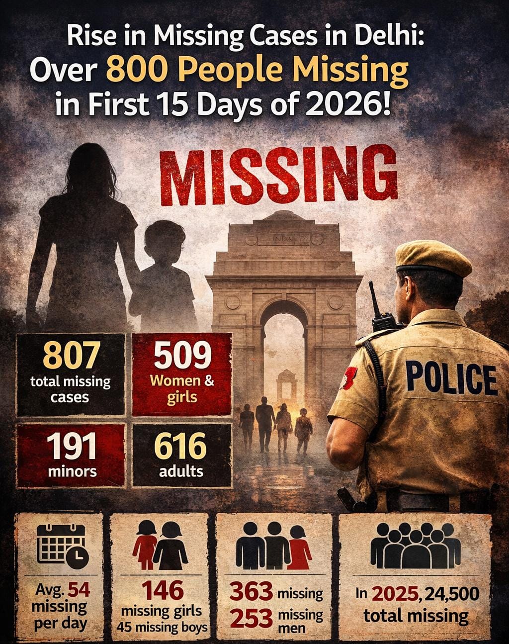 ದಿನಕ್ಕೆ ಸರಾಸರಿ 54 ಜನ: ಜನವರಿ 1 ರಿಂದ 15 ರ ನಡುವೆ ದೆಹಲಿಯಲ್ಲಿ ದಿನವೊಂದಕ್ಕೆ ಸರಾಸರಿ 54 ಜನರು ಕಾಣೆಯಾಗಿದ್ದಾರೆ.